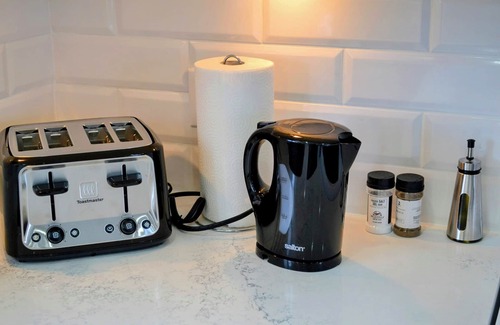 Fully equipped and updated kitchen with everything you need to enjoy your meals, whether cooked in-house or take out. Appliances include: Fridge/Freezer, Microwave, Stove/Oven, Air Fryer, Kettle, toaster, and a dishwasher. Kitchen cabinets also include cooking utensils and supplies such as pans, plates, mugs, glasses, cutlery and more. The complimentary coffee & tea station is an added bonus for those who need their morning fix.