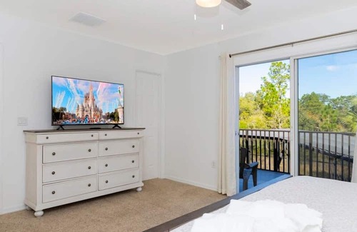 The upper floor features the main master bedroom with en-suite bathroom, King Size bed and Smart TV. There is another bedroom with Queen Size Bed and balcony. Last bedroom Mickey-themed room with Twin-over-Full bunk bed with trundle. All the rooms have quality furnishings and the Master is simply beautiful boasting as it does a balcony with overlooks the lake.