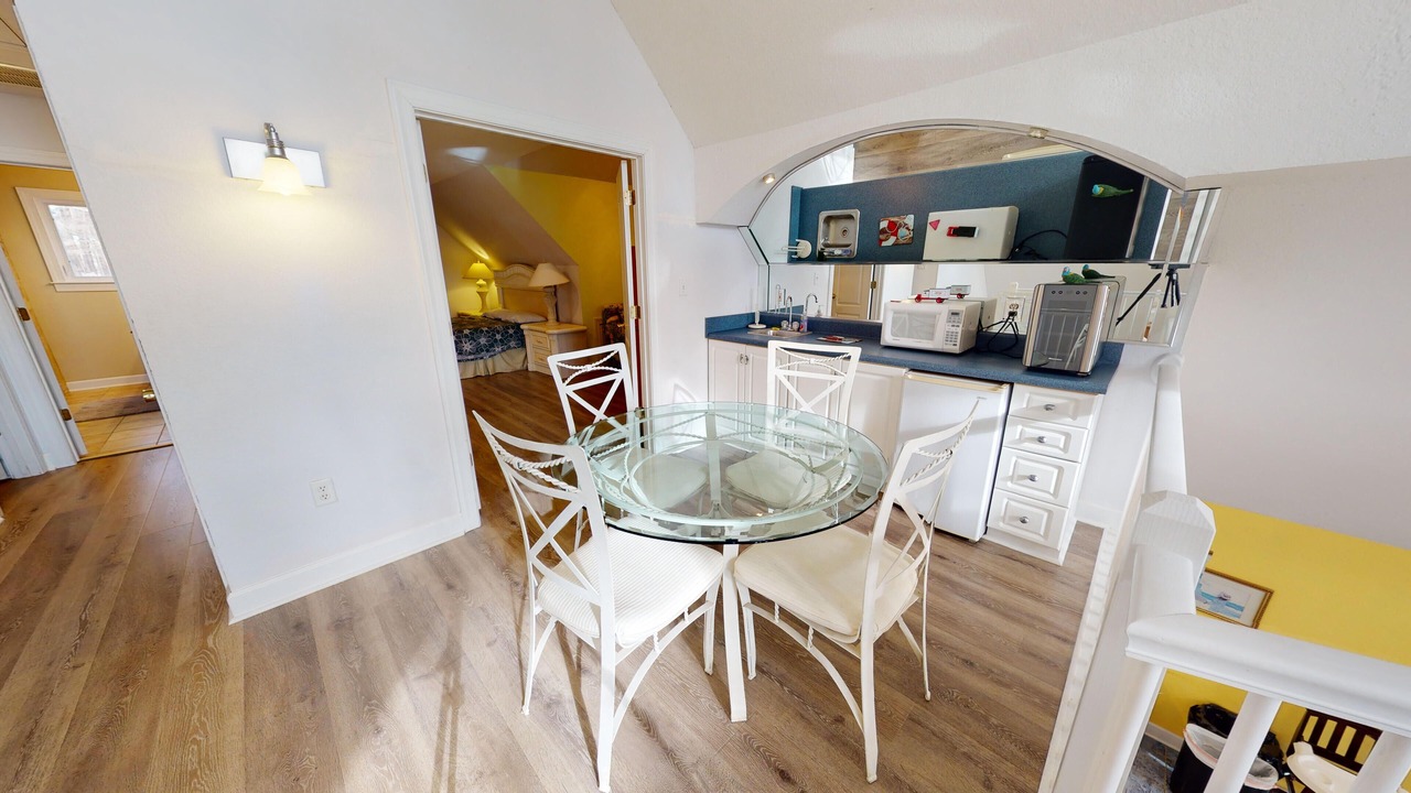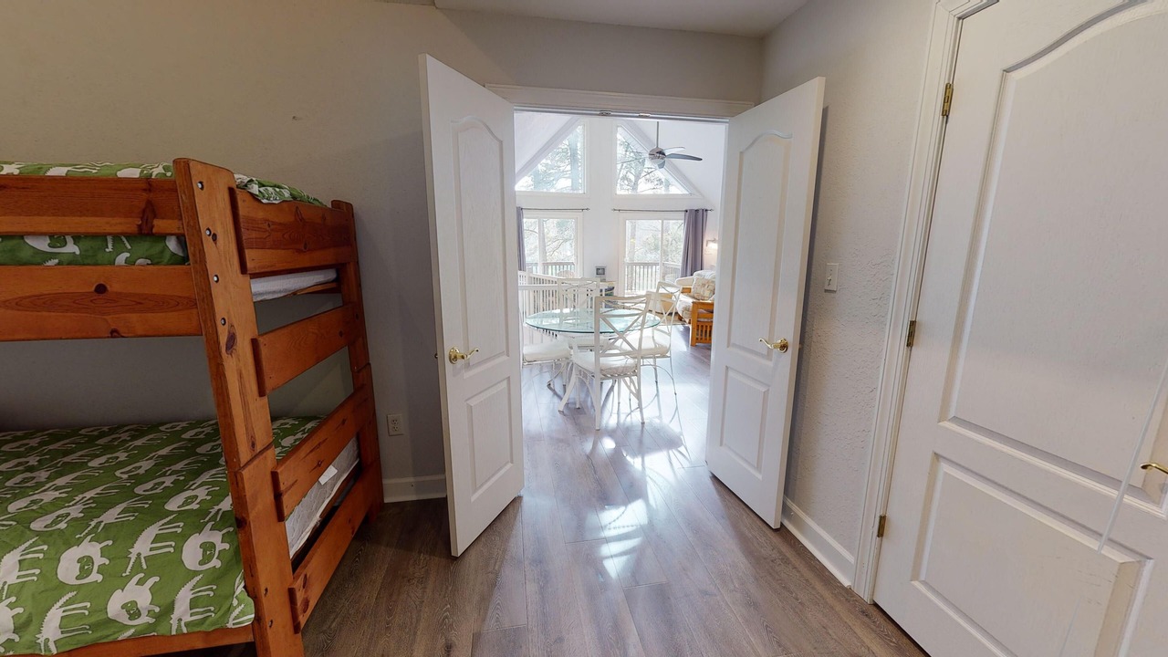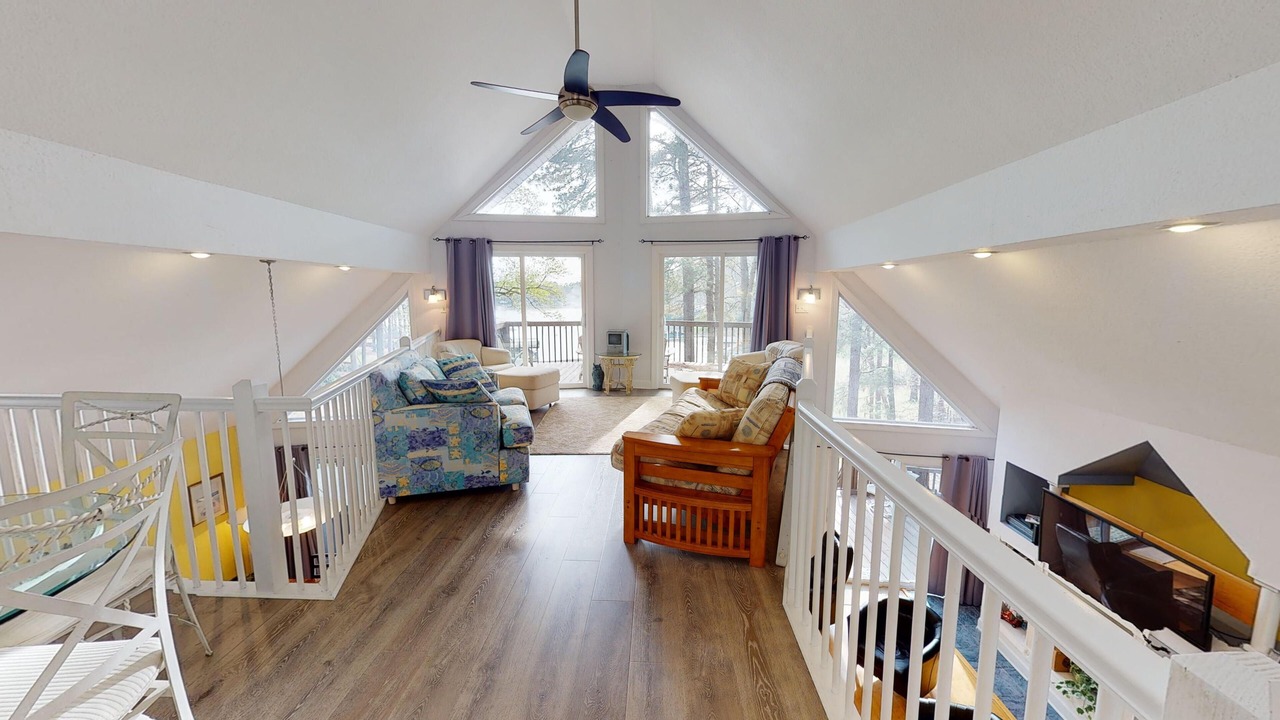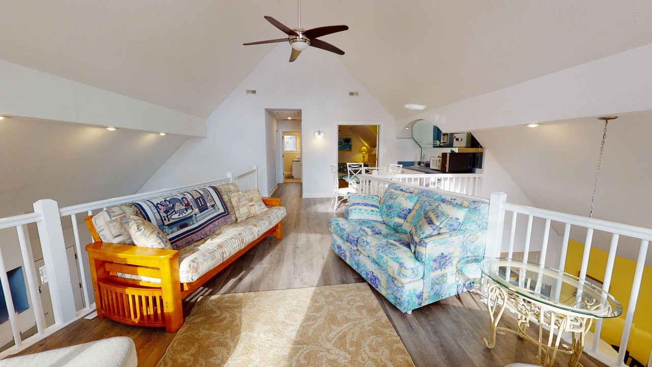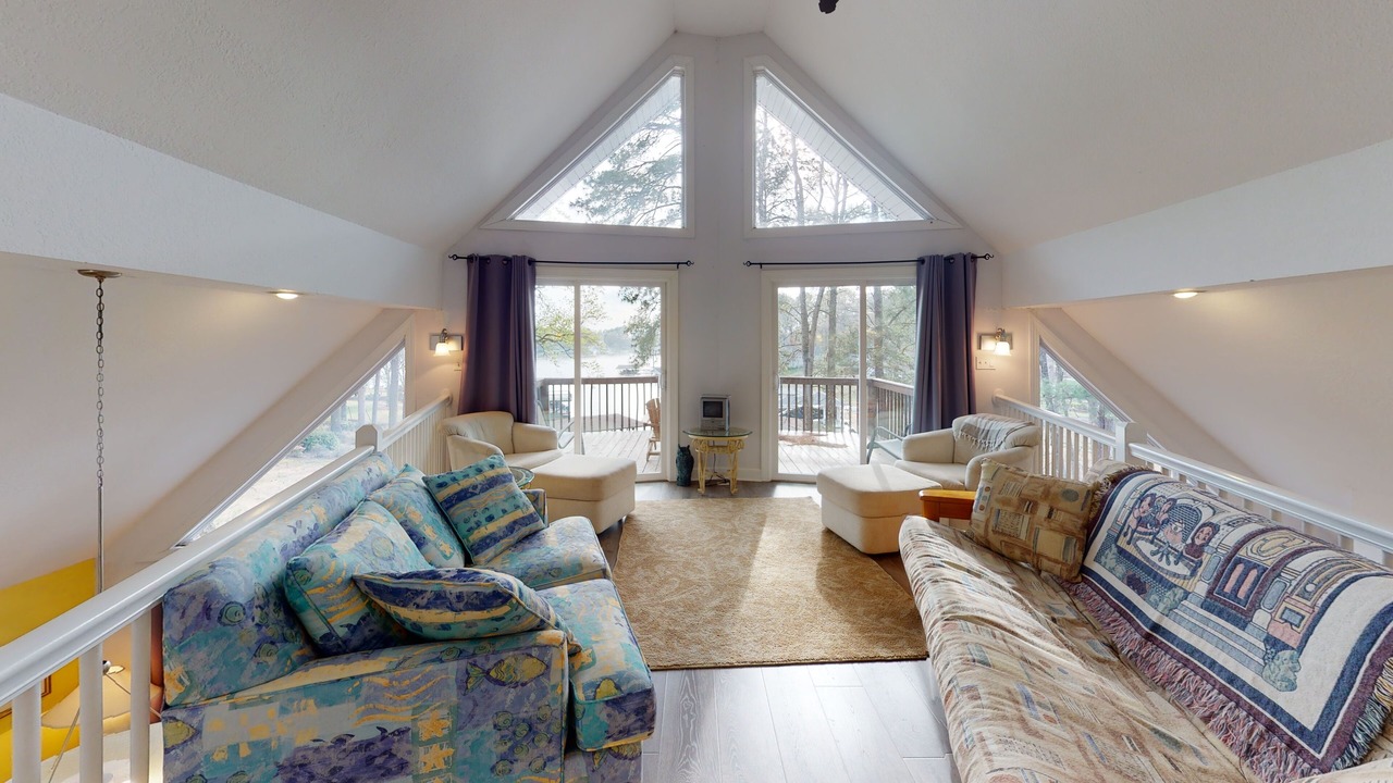 Upper level has newly remodeled full master style bathroom with tub and separate shower. Upper level has 2 bedrooms: 1 with a Queen bed, a set of twin bunk beds, and the other room has two twin beds. A kitchenette area is located on this level, with a mini-fridge, and sink, along with a private balcony. Also on this level is a sitting area equipped with a love seat, and two comfy chairs, along with a couch that has a pull-out sofa.