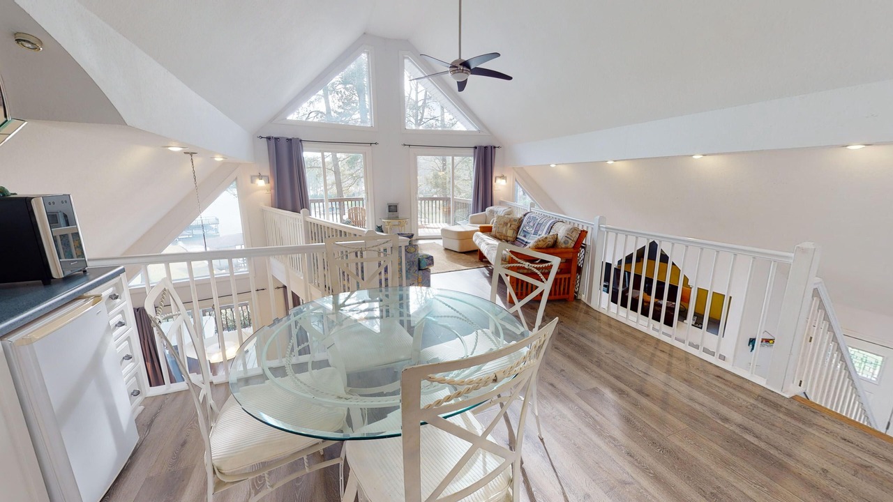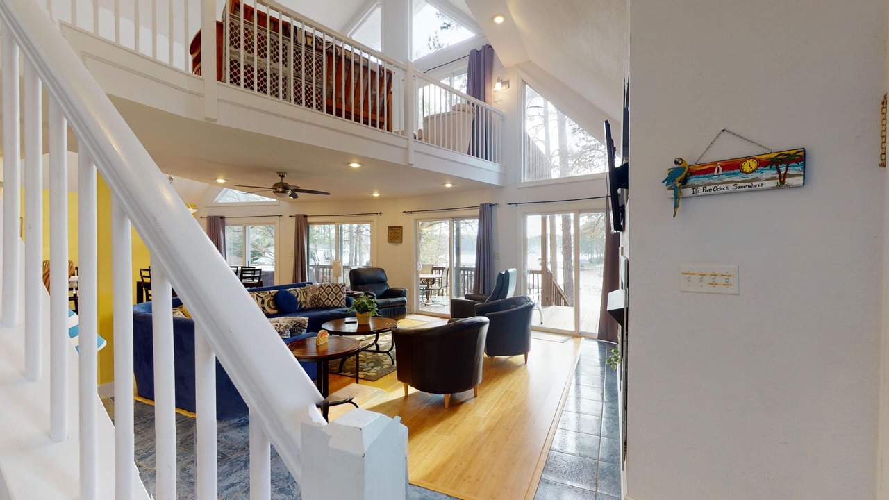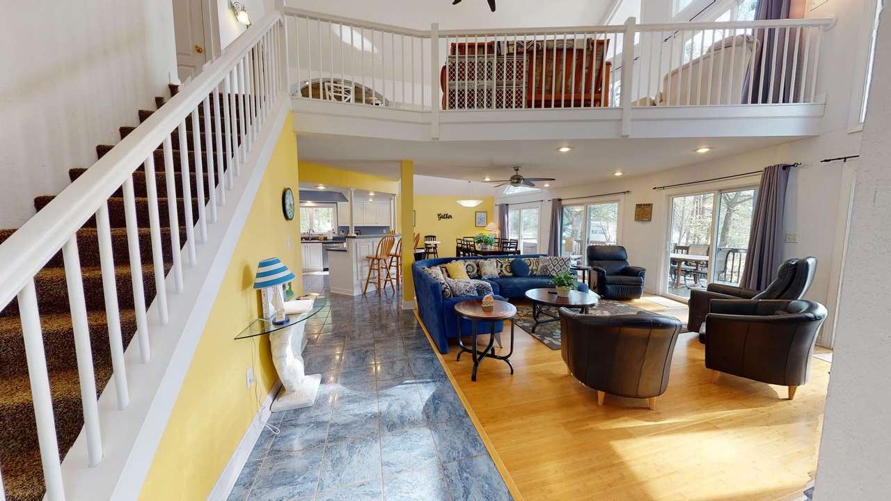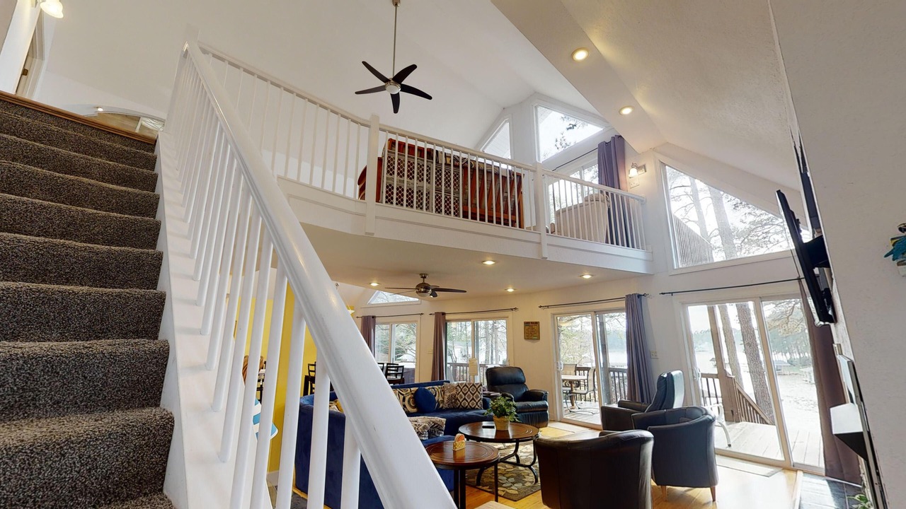 Two living areas with a kitchen and a bar/kitchenette. Main level living and dining room has a wall of glass. Spectacular views overlooking the lake from inside or on the main deck (partially covered), balcony, fire pit to make s'mores at night and dock; with seating on each.