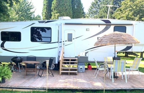The camper is located at our campsite at Arrowhead Golf Course and Marina You'll have access to a boat launch with opens up to the canal. There is plenty of parking room available right next to our camper.