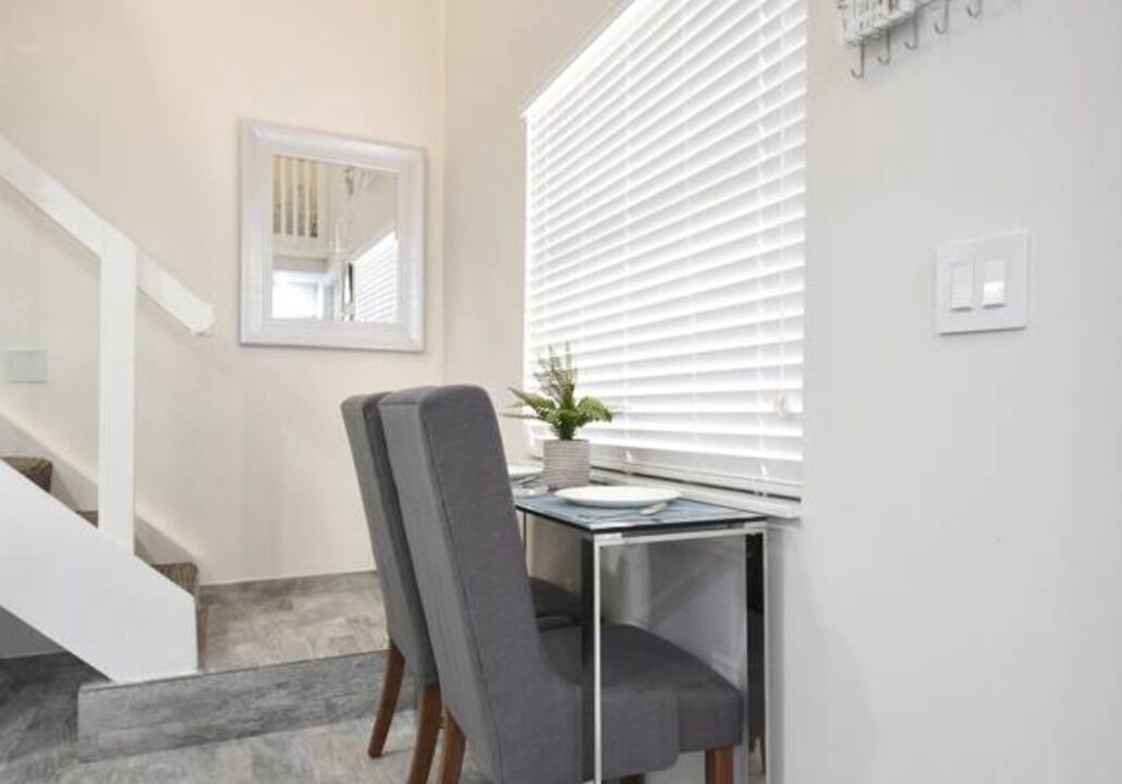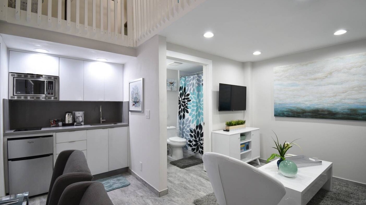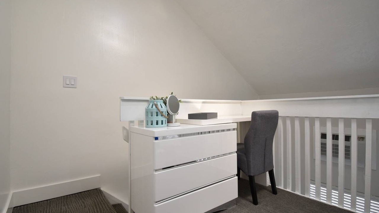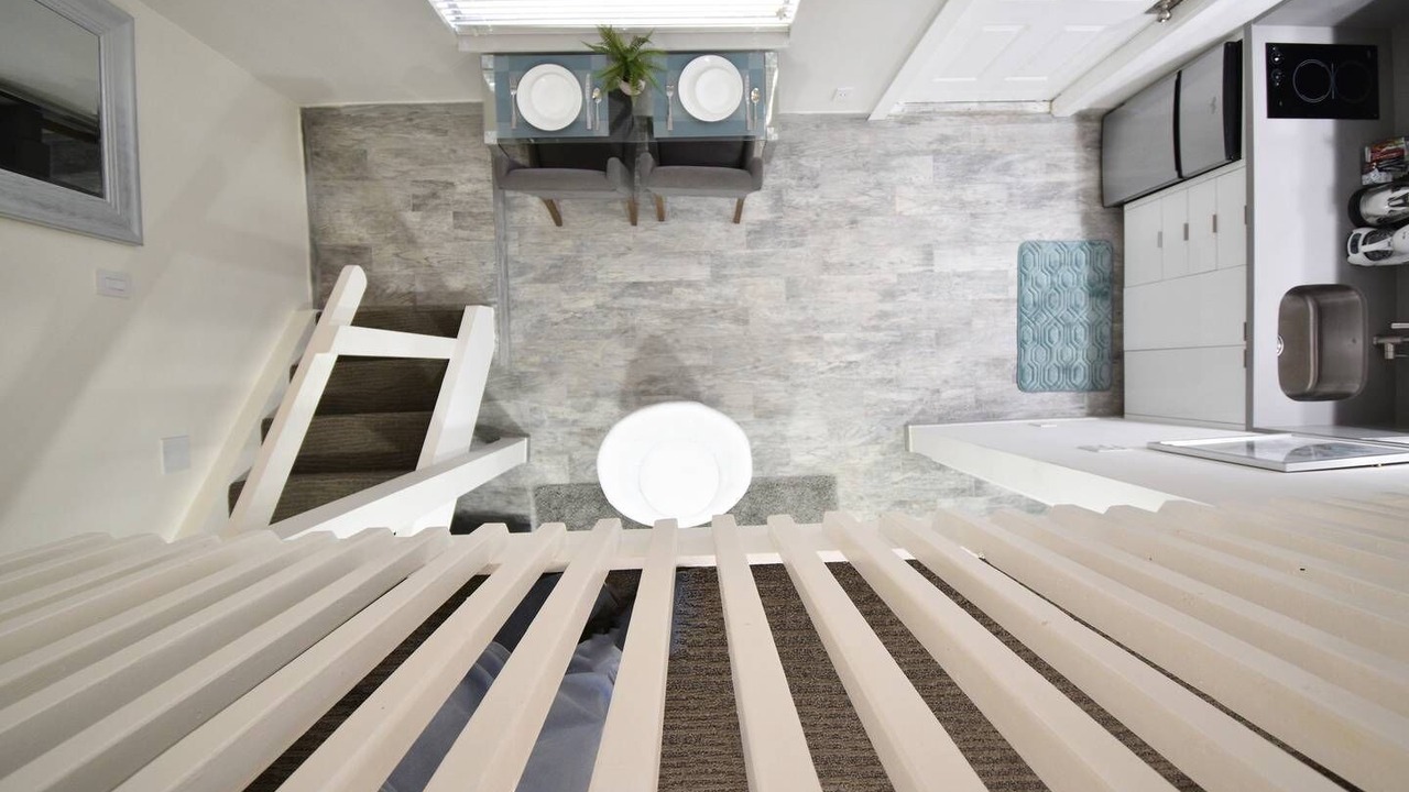 In this apartment, you will find everything you need! We provide a kitchenette, modern accents, and a super comfortable queen-size bed in the loft upstairs. Downstairs we have a sofa, a 40-inch Roku TV and a designated open office space with desk and chair.