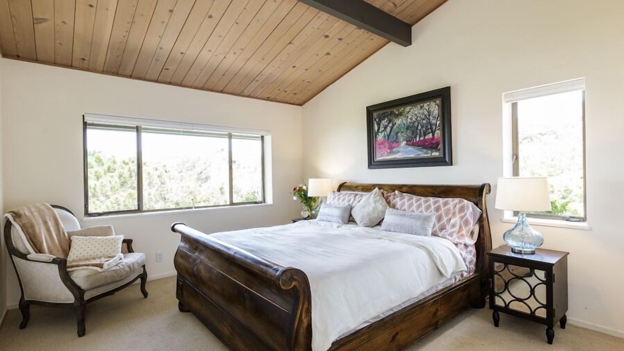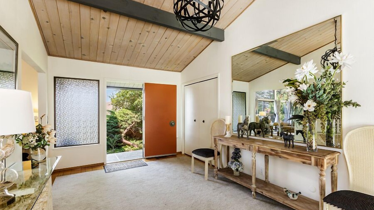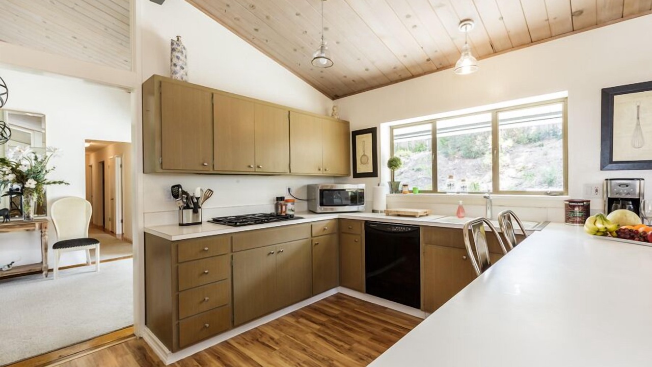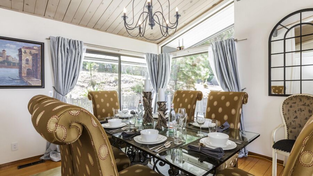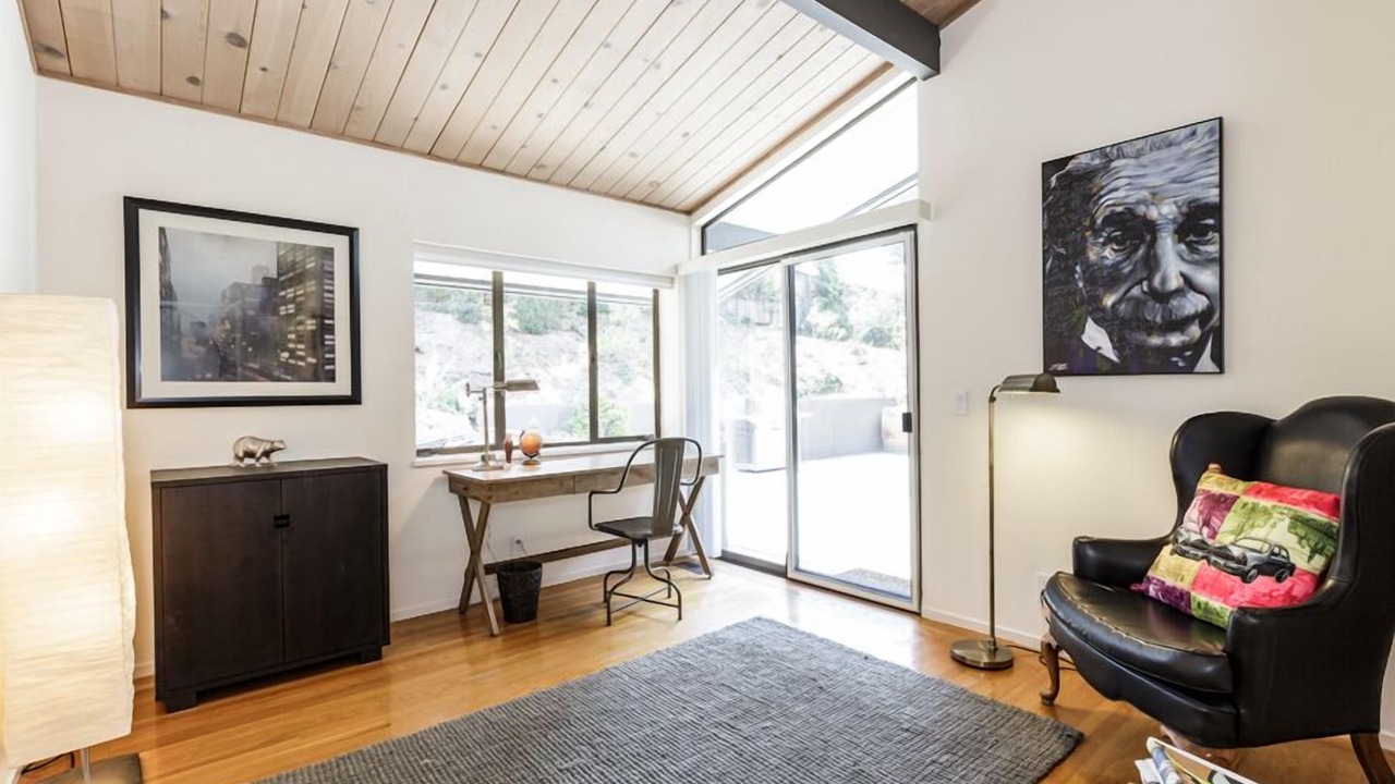 This is a vintage, authentic Mid-century sprawling ranch style 4 bedroom 2 bathroom home with sweeping views of the Richardson Bay, Mt. Tamalpais, and Tiburon hillside. The single story home is tastefully furnished with high-end finishes and high thread count linens. Currently the home is set up with one of the rooms used as an office. It is located on a hill near Reed School and just a quick drive down the hill to the quaint town of Tiburon. The large, open concept living room/dining room is open to the kitchen, creating a warm and inviting atmosphere. Floor to ceiling windows flood the space with natural light.