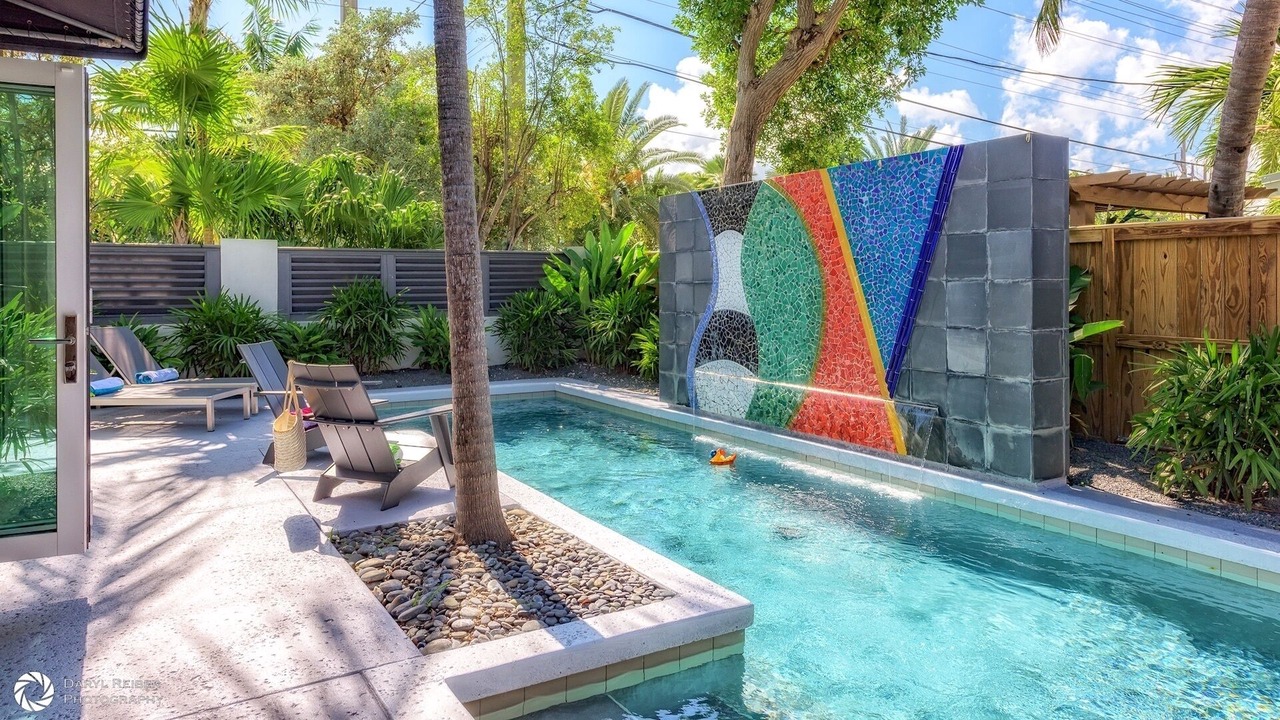 The pool area is your very own exotic retreat, surrounded by gorgeous tropical landscaping and fully fenced for maximum privacy. There is plenty of space for your group to enjoy both the sunshine and the shade. Surrounded by chaise lounges, the heated pool gets lots of sun throughout the day and features a distinctive mosaic waterfall wall. There is a large dining table with seating for 8, an outdoor sectional sofa, and propane BBQ grill under the pergola.