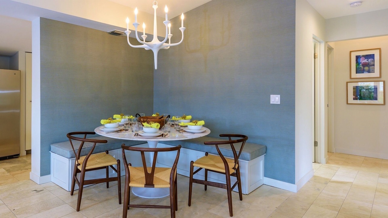 The open plan living area of MIDTOWN MOSAIC is perfect for the whole gang to gather and enjoy time together. The wall of glass Euro doors provide an unobstructed view of your outdoor oasis and can be completely opened to create a seamless indoor/outdoor living space. The living room has a large sofa and chairs to stretch out on, with a large flat screen SMART TV. The galley-style kitchen is fully equipped with stainless steel appliances, including a gas range, and all of the tools and equipment you will need to prepare a gourmet meal. There is bar seating for a casual bite, and a cozy dining banquette just off the kitchen.