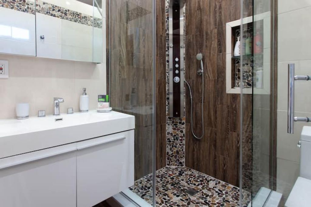 The apartment uses clever and visually stunning design to make the most of the available space. A high wall-mounted flat screen television can be seen from anywhere in the room, so you can cozy up in the large, king-size bed and watch your favorite TV show.