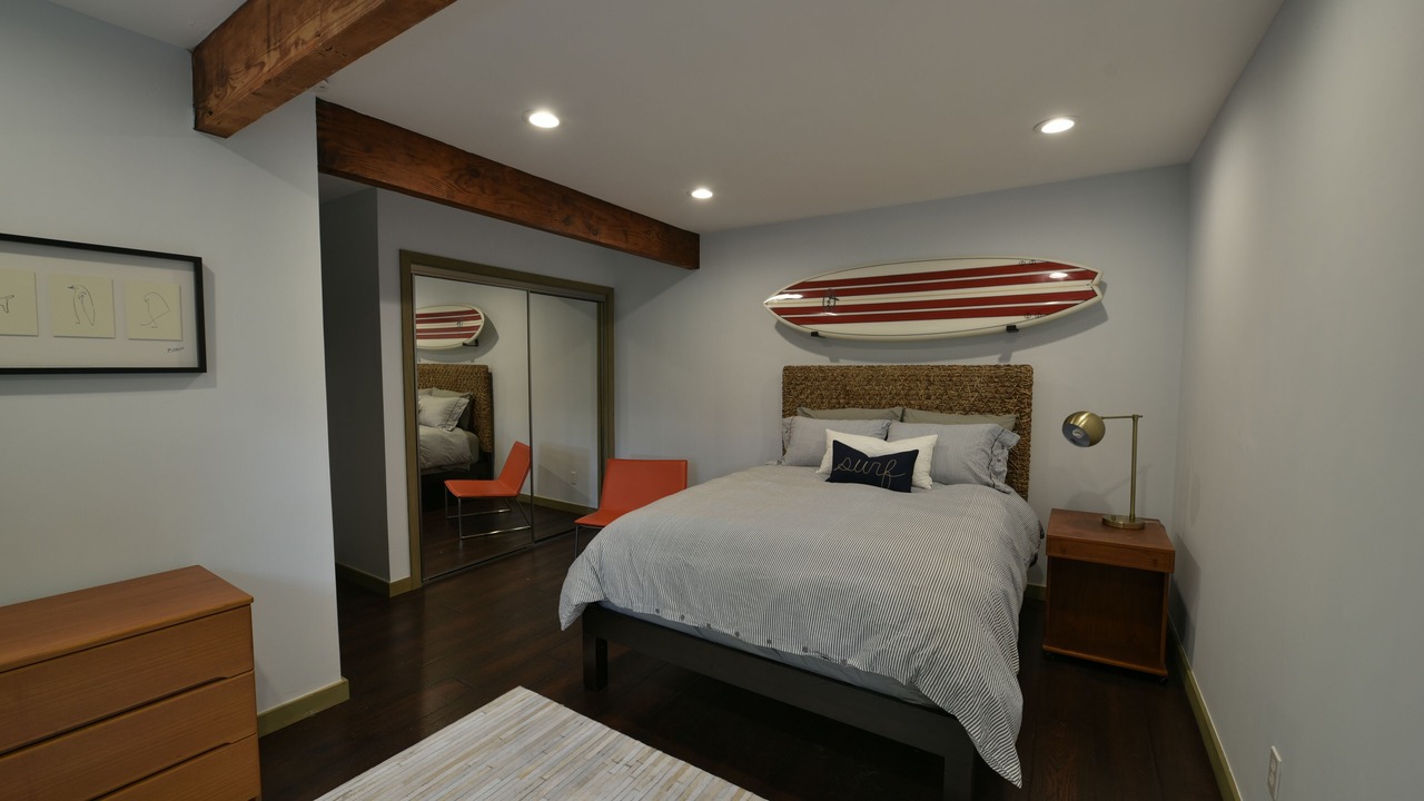 The spacious lower level includes guest bedroom 2 with luxurious queen bed and sliding door to wrap-around deck, and guest bedroom 3 with another luxurious queen bed, large picture window and surfboard on the wall. A large updated bathroom with rainfall shower head. The family room has 9’ knotty pine ceilings, 65” flat screen HDTV, and leather queen sofa sleeper. There is also a full size washer and dryer. The large wrap-around deck has a patio table that seats 8 and a gas bbq for enjoying outdoor dining.