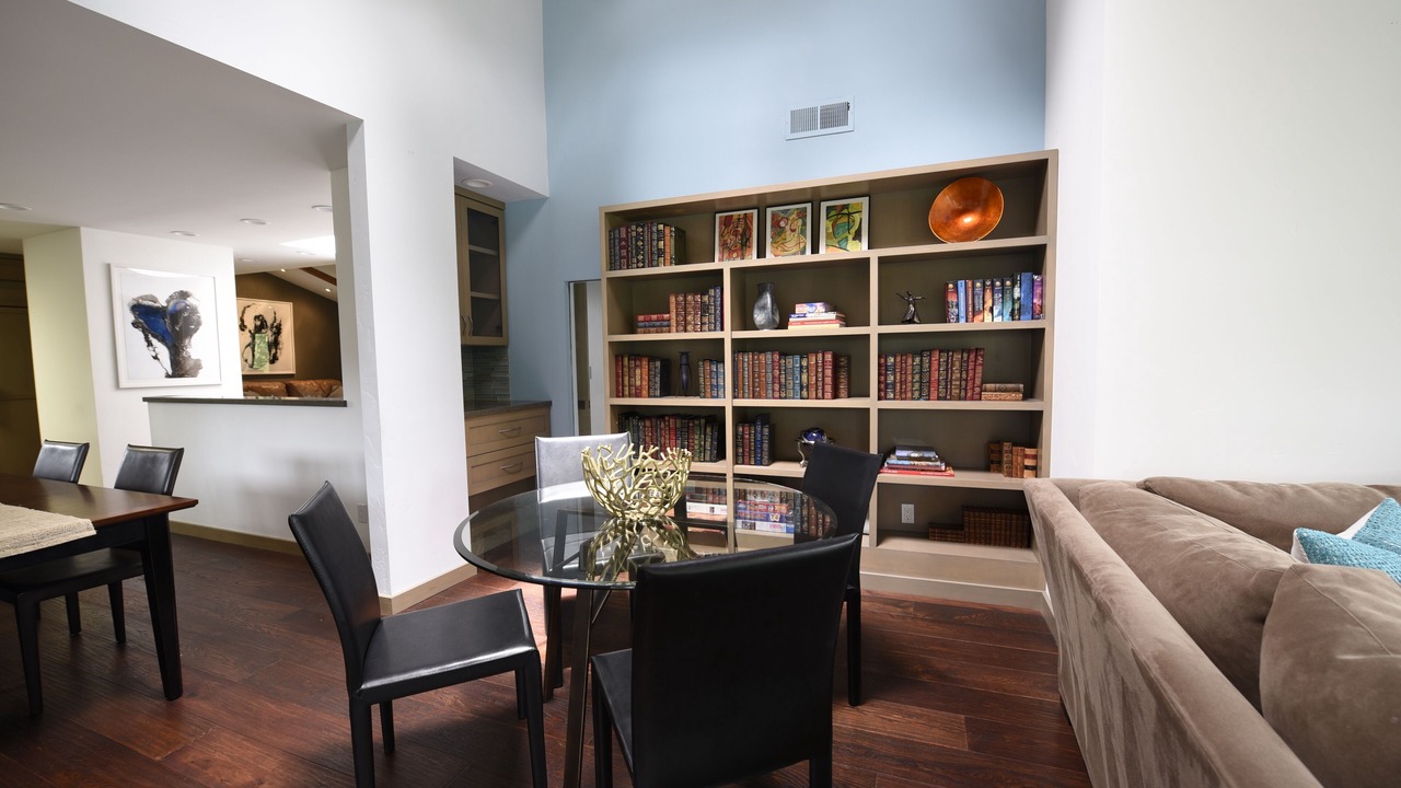 On the main level of the home is a gourmet kitchen with an island, state of the art appliances and a dining area with seating for 10. The living room has a vaulted knotty pine ceiling, large sectional couch, game table, pellet stove and floor to ceiling windows overlooking the canyon and golf course with sliding doors to a full wrap-around entertaining deck. The den has vaulted beamed ceiling, leather queen sofa sleeper, built-in stone desk top and 55” HDTV. The large master suite has a cal king bed with dual shower heads and dual sinks in the bathroom. There is also a full guest bathroom on the main level. The master and guest baths are newly renovated and elegantly designed with top quality stone counters and floors.